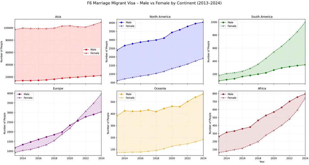 F6. While there is no explicit statistic quantifying Koreaboos, the F6 marriage visa is one that comes closest. A F6 visa is for someone who’s married to a Korean. Not all with a F6 visa are someone who married specifically desiring a Korean due to their obsession with K-culture. But those that did are within that data set.