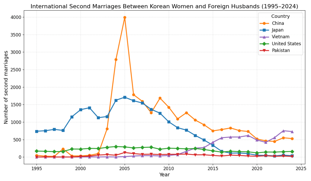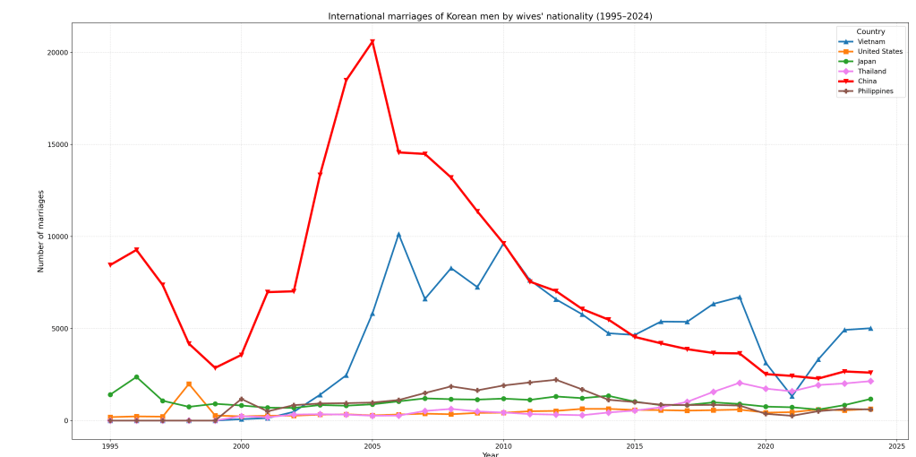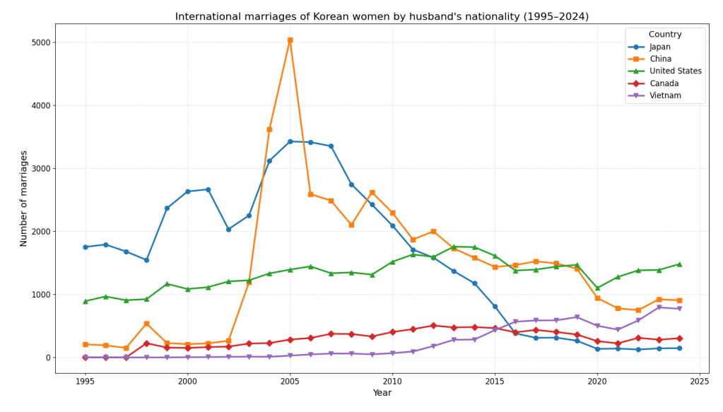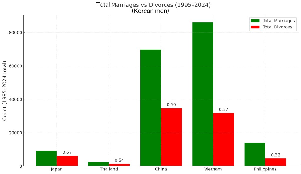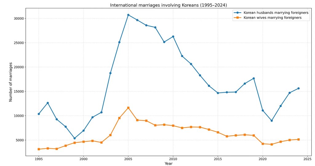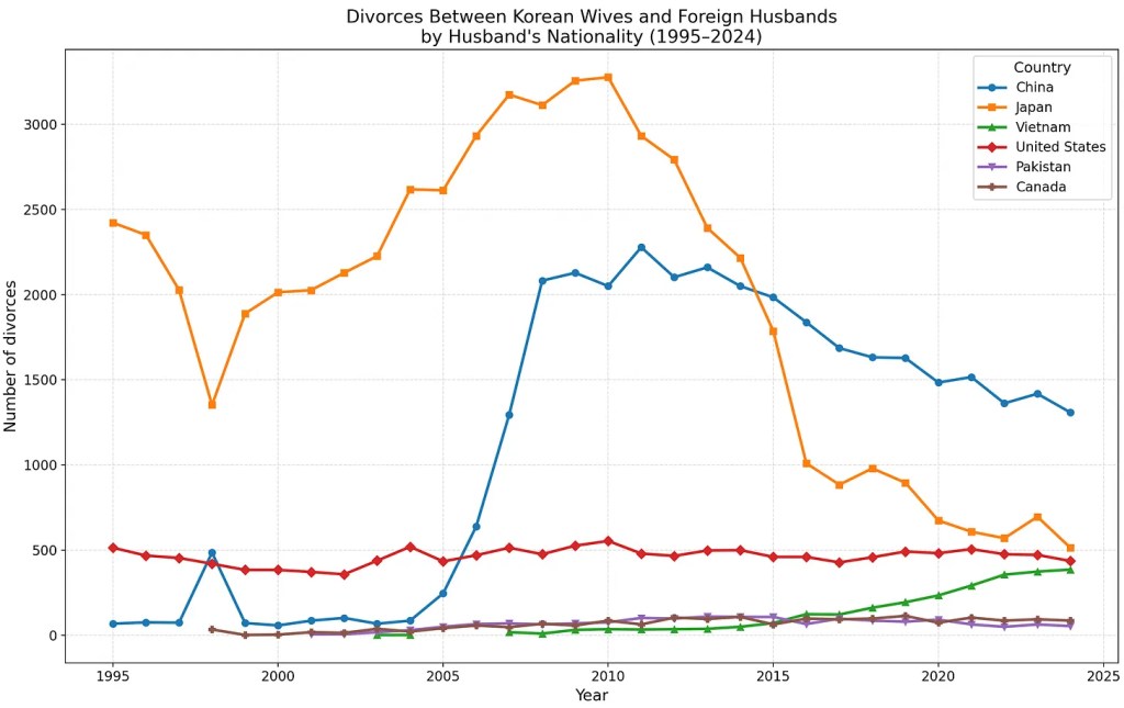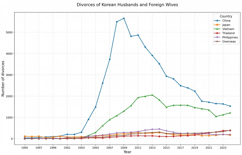 The one specific reason given for the high divorce rates with Japanese wives and Korean husbands are that Japanese women are far more financially independent. And given that most have F4 visa due to their Korean heritage, there is less need for one to be tied down if the romance fades. As for Thailand, I’d attribute the high divorce rate to most marriages being migrant marriages where one is looking to migrate for better economic opportunities rather than for love, a conclusion reinforced by broader migration data showing that Thai nationals have represented the largest share of visa overstays in Korea since 2016.