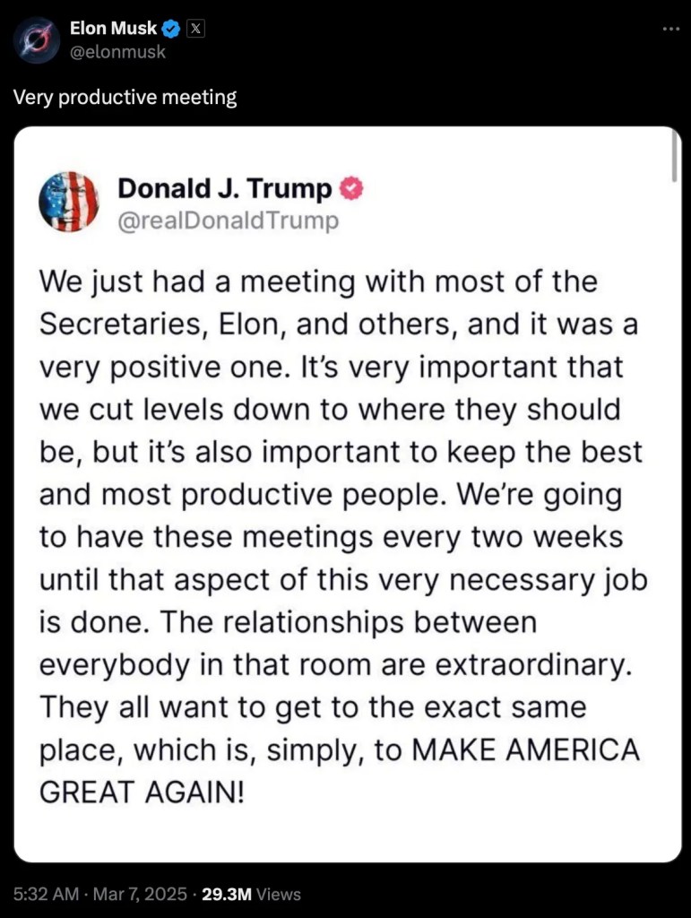 No more falsettos. No more venerable, institutionalized conductors. No more singing in the dark. Trump is on the throne with the spotlight perpetually turned ON. A megaphone in his right hand. He’s got a conductor in Elon Musk orchestrating the entire show. Everyone on stage has the same hymn sheet. The ones who dare not sing are cast aside. The ones who question the rhythm, irrespective of their earned reputation are publicly shamed.