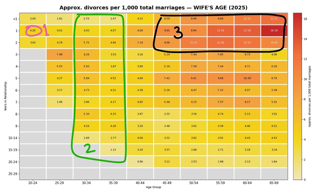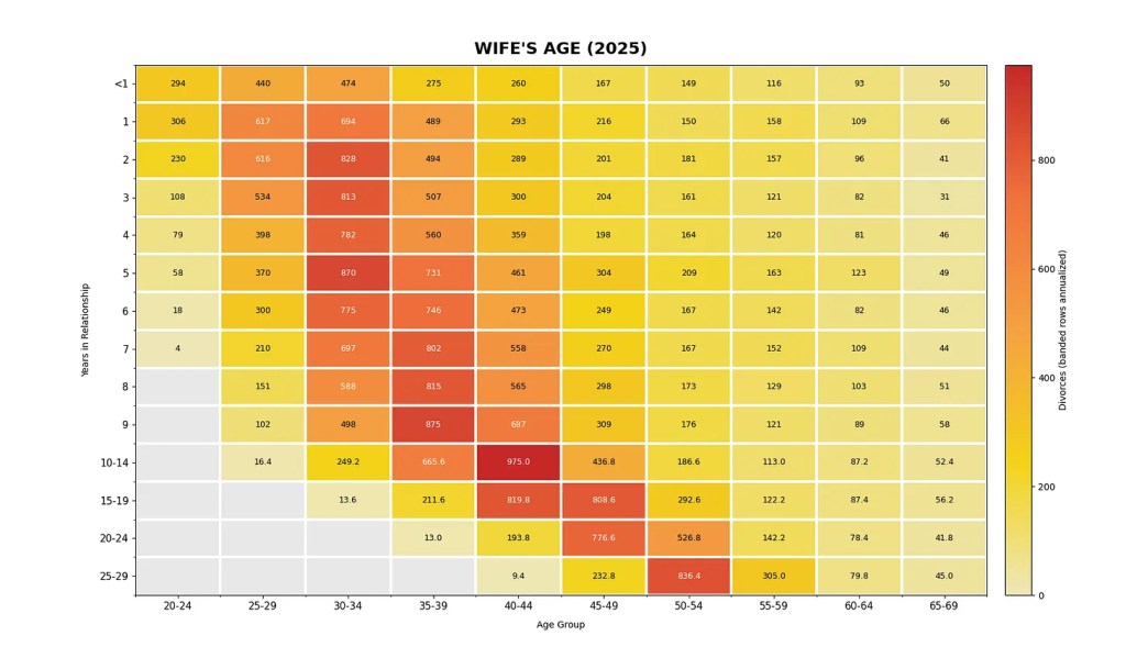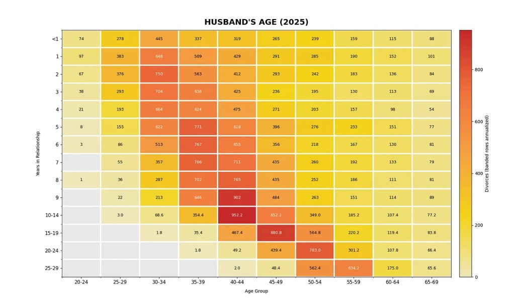 Having said that, here is the chart for the age of women who divorced in 2025, the number of years they were in a relationship for, before they divorced and the total number of divorces in each category.