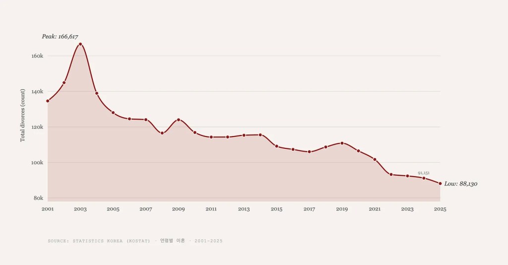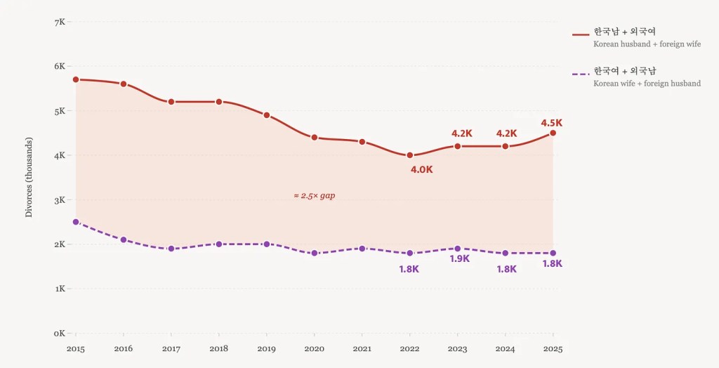 Post COVID, there was an uptick in the number of Koreans marrying foreigners, but it is beginning to plateau, in fact there’s been a drop in 2025 (20.7k) from the previous year (20.8k). However, the number of divorces between foreigners and Koreans is increasing.