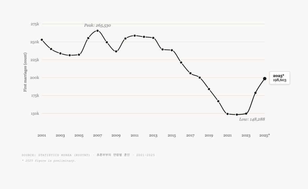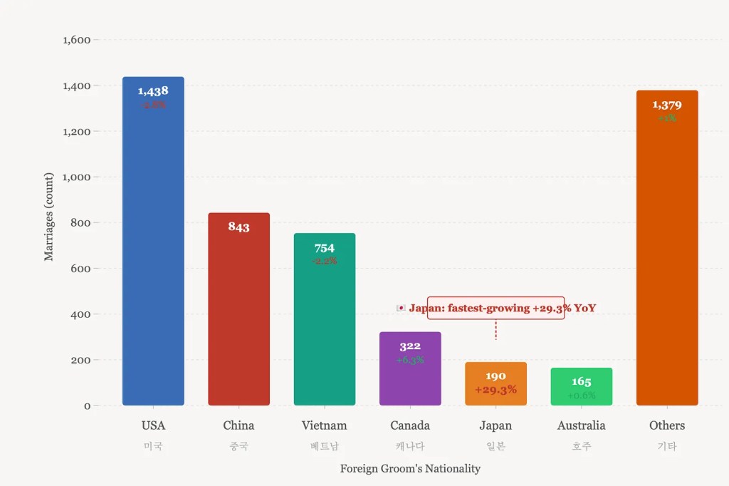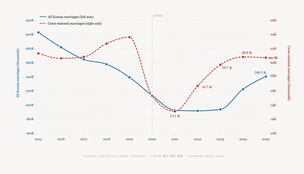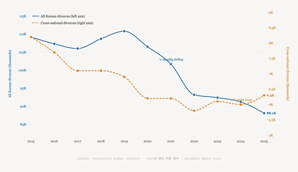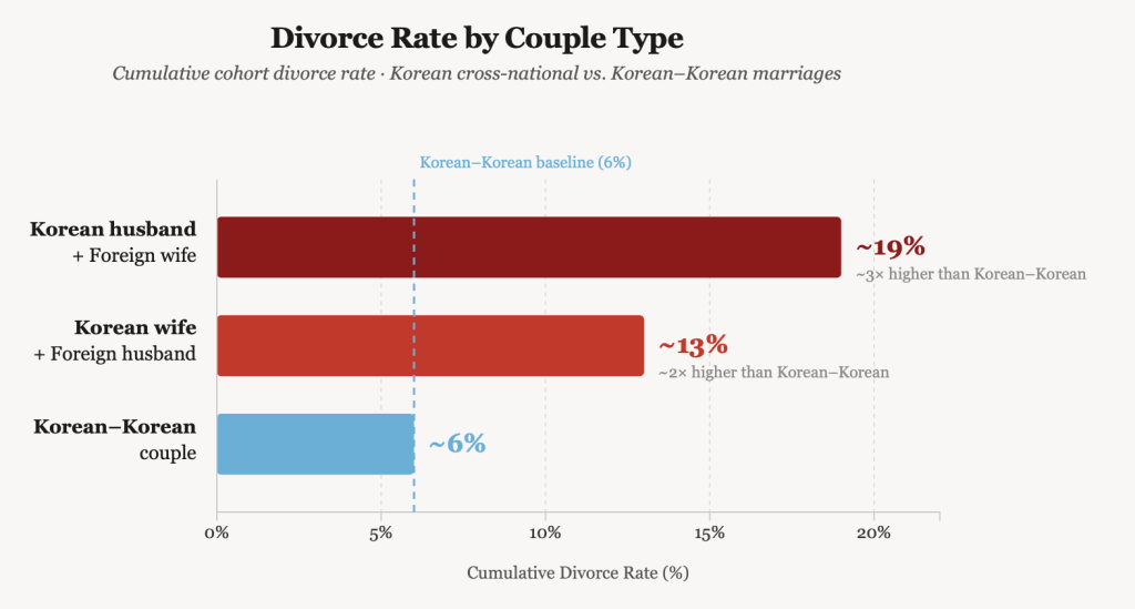 Data shows that Korean husbands with a foreign wife divorce at roughly three times the rate of Korean–Korean couples, while Korean wives with a foreign husband divorce at about twice the rate. By the numbers alone, the safest bet appears to be a Korean marrying a Korean. But if you do feel the butterflies in your stomach when you see him or her, then perhaps the more relevant question is not what the divorce rate is, but whether you are both willing to do the harder work that cross-cultural marriages genuinely demand: the language, the in-laws, the unspoken expectations carried across borders. The data captures what went wrong for others. It says nothing about what you are capable of getting right.