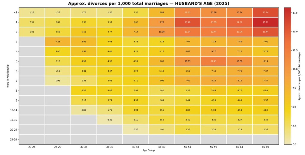 And below is the chart for the age of men who divorced in 2025 along with the number of years they were in a relationshipbefore they divorced and the number of divorces.