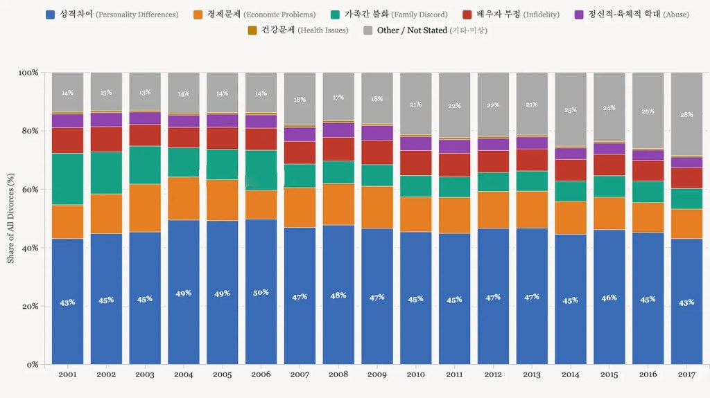 This erosion of meaningful data is confirmed by the steady rise of “other/not stated,” which nearly doubled from 14% to 28% over the period. Combined with privacy concerns, the Korean government eventually stopped collecting divorce reasons altogether after 2017.